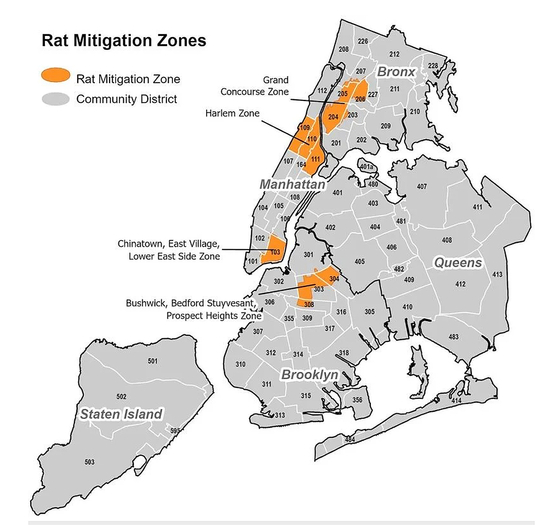 이번에 뉴욕시가 8개 지역을 추가함으로써 ‘쥐 감축 지역’은 차이나타운, 그리니치 빌리지, 브루클린 부시윅·베드포드스타이브슨트·프로스펙트하이츠, 브롱스 그랜드콘커스 등을 포함해 10개 정도로 늘었다.