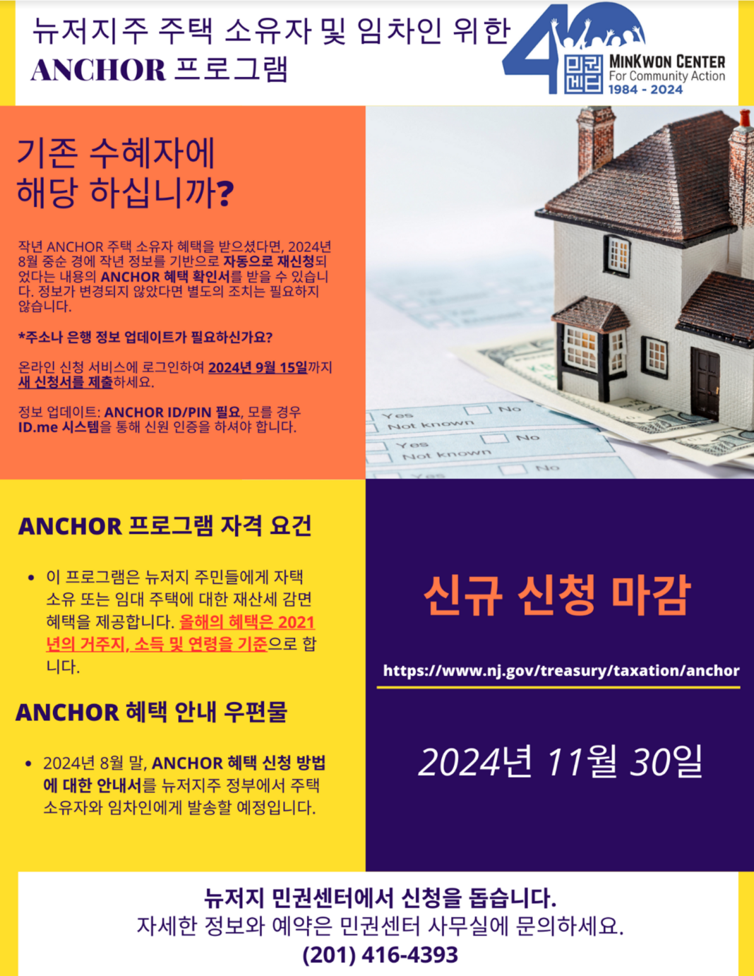 뉴저지 민권센터가 주택 소유자와 세입자를 대상으로 하는 ‘앵커(ANCHOR) 프로그램’ 신청 지원에 나섰다. 이 프로그램은 뉴저지 주민들의 주거 안정을 돕기 위해 재산세 감면 혜택을 제공하는 것으로, 2021년의 거주 상황과 소득, 연령을 기준으로 혜택이 결정된다.
