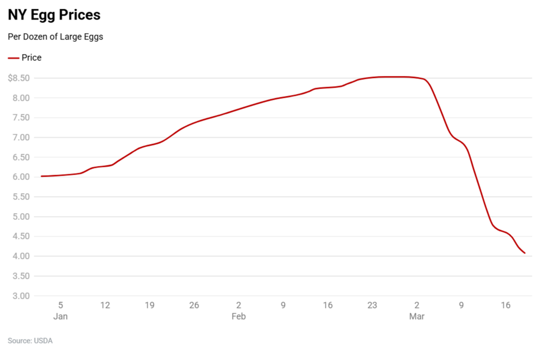 새로운 닭이 계란을 낳기까지는 약 5개월이 걸린다. 많은 농부들이 자신들의 닭 무리를 교체하려고 하기 때문에, 그들은 가격이 곧 평균 수준으로 내려갈 것으로 보지 않는다.